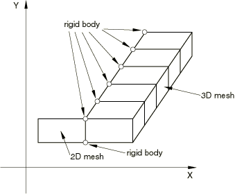 If the rigid body reference node is positioned at the center of mass, the reference node for an axisymmetric rigid body will, thus, be repositioned at the center of mass of the circumferential slice. These assumptions are consistent with the manner in which Abaqus handles other axisymmetric features but are noted here because of the deviation from classical rigid body theory. Axisymmetric rigid bodies should be connected only to axisymmetric deformable elements. To model the connection of a rigid component with an axisymmetric geometry to three-dimensional deformable elements, model the axisymmetric rigid component as a three-dimensional rigid body consisting of the appropriate three-dimensional elements. Three-dimensional rigid bodyA rigid body with a three-dimensional geometry has six active degrees of freedom: 1, 2, 3, 4, 5, and 6 (, , , , , ). Here, the x-, y-, and z-directions coincide with the global X-, Y- and Z-directions, respectively. If a nodal transformation is defined at the rigid body reference node, the x-, y-, and z-directions coincide with the user-defined local directions. In general, three-dimensional rigid bodies will possess a full, nonisotropic inertia tensor and can behave in a nonintuitive manner when they are spun about an axis that is not one of the principal inertia axes. Classical phenomena of rigid body dynamics (e.g., precession, gyroscopic moments, etc.) can be simulated using three-dimensional rigid bodies in Abaqus. In most cases three-dimensional rigid bodies should be connected only to three-dimensional deformable elements. If it is physically relevant, a three-dimensional rigid body can be connected to two-dimensional plane stress, plane strain, or axisymmetric elements; however, you should always constrain the z-displacement, x-axis rotation, and y-axis rotation of the rigid body. The above procedure is useful when incorporating a two-dimensional plane strain approximation in one region of a model and a three-dimensional discretization in another. Rigid bodies can be used to constrain the two finite element geometries at their interface as shown in Figure 3. A unique rigid body should be used at each node in the plane along the interface to handle the constraint properly. Figure 3. Rigid body nodes used to connect a two-dimensional and