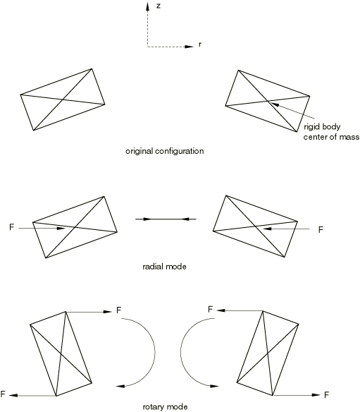 ![]() The shell elements are assumed to be stiff (negligible bending is shown in the figure). When the nodes common to the rigid body and the shell elements are tie nodes, the rotation applied to the rigid body is transmitted directly to the shell elements. When the common nodes are pin nodes, the rigid body rotation is not transmitted directly to the shell elements, which can result in large relative motions between the rigid body and the adjacent shell structure. Assigning elements to a rigid bodyTo include elements in the rigid body definition, you specify the region of your model containing all of the elements that are part of the rigid body. Elements in this region or nodes connected to the elements in this region cannot be part of any other rigid body. Table 1 lists the continuum, structural, and rigid element types that can be included in a rigid body and the respective node types generated in the rigid body.