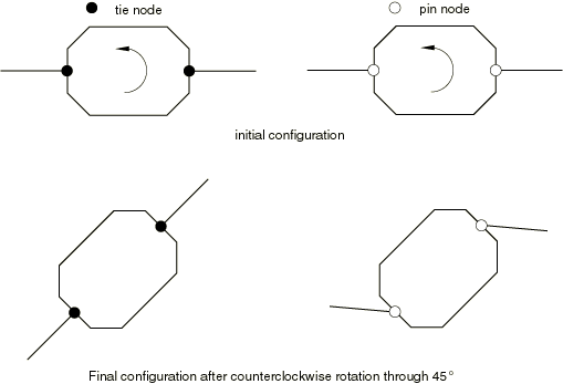 The rigid body node type is determined by the type of elements on the rigid body to which the node is attached. You can also specify the node type when you assign nodes directly to a rigid body. For pin nodes only the translational degrees of freedom are part of the rigid body, and the motion of these degrees of freedom is constrained by the motion of the rigid body reference node. For tie nodes both the translational and rotational degrees of freedom are part of the rigid body and are constrained by the motion of the rigid body reference node. The node type has important implications when the node is connected to rotary inertia elements, deformable structural elements, or connector elements or when the node has concentrated moments or follower loads applied to it. Rotary inertia elements and applied concentrated moments affect the rigid body only when associated with a tie node. Rigid body connections to deformable elements always involve the translational degrees of freedom; rigid body connections to deformable shell, beam, pipe, and connector elements also involve the rotational degrees of freedom if the connection is at a tie node. The behavior of the two types of connections is illustrated in Figure 1, which shows an octagonal rigid body connected to two deformable shell elements through nodes at opposite ends subjected to an applied rotational velocity. Figure 1. Rigid body with tie node and pin node connections.