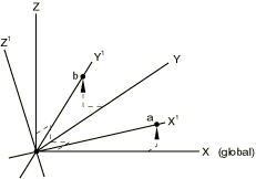 The coordinate transformation defined at a node must be consistent with the degrees of freedom that exist at the node. For example, a transformed coordinate system should not be defined at a node that is connected only to a SPRING1 or SPRING2 element, since these elements have only one active degree of freedom per node. Input File Usage You must identify the node set for which the local transformed system is defined. TRANSFORM, NSET=name Abaqus/CAE Usage In Abaqus/CAE you define a local coordinate system independent of its use and then refer to it when you apply a load or boundary condition at a node. Any module: Type: CSYS: Interaction module: load or boundary condition editor: CSYS: Edit: select local coordinate system Defining a local coordinate system in a model that contains an assembly of part instancesIn a model defined in terms of an assembly of part instances, you can define a nodal transformation at the part, part instance, or assembly level. A nodal transformation defined at the part or part instance level will be rotated according to the positioning data given for each instance of that part (or for the part instance). See Assembly definition. Multiple transformation definitions are not allowed at a node, even if one of them is at the part level and another is at the assembly level. Large-displacement analysisThe transformed coordinate system is always a set of fixed Cartesian axes at a node (even for cylindrical or spherical transforms). These transformed directions are fixed in space; the directions do not rotate as the node moves. Therefore, even in large-displacement analysis, the displacement components must always be given with respect to these fixed directions in space. Defining a rectangular Cartesian coordinate transformationIn a rectangular Cartesian transformation the transformed directions are parallel at all nodes of the set. The coordinates of two points must be given, as shown in Figure 1. Figure 1. Cartesian transformation.
