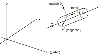 ![]() The first point, a, must be on a line through the global origin; this point defines the transformed -direction. The second point, b, must be in the plane containing the global origin and the transformed - and -directions. This second point should be on or near the positive -axis. Input File Usage TRANSFORM, NSET=name, TYPE=R (default) Abaqus/CAE Usage Any module: Type: CSYS: select any method, and click : Rectangular: Defining a cylindrical coordinate transformationThe radial, tangential, and axial directions must be defined based on the original coordinates of each node in the node set for which the transformation is invoked. The global () coordinates of the two points defining the axis of the cylindrical system (points a and b as shown in Figure 2) must be given. Figure 2. Cylindrical transformation.