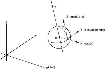 ![]() The origin of the local coordinate system is at the node of interest. The local -axis is defined by a line through the node, perpendicular to the line through points a and b. The local -axis is defined by a line that is parallel to the line through points a and b. The local -axis forms a right-handed coordinate system with and . A cylindrical coordinate system cannot be defined for a node that lies along the line joining points a and b. Input File Usage TRANSFORM, NSET=name, TYPE=C Abaqus/CAE Usage Any module: Type: CSYS: select any method, and click : Cylindrical: Defining a spherical coordinate transformationThe radial, circumferential, and meridional directions must be defined based on the original coordinates of each node in the node set for which the transformation is invoked. The global () coordinates of the center of the spherical system, a, and of a point on the polar axis, b, must be given as shown in Figure 3. Figure 3. Spherical transformation.
