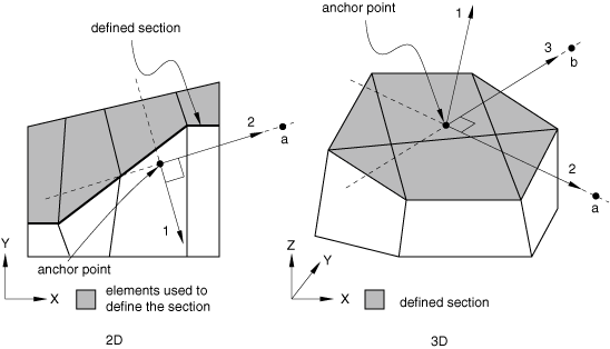 Integrated outputIn Abaqus/Explicit integrated output can be requested either over a surface or over an element set; in Abaqus/Standard integrated output can be requested over a surface. An integrated output request is used to write the time history of variables such as the total force transmitted across a surface, the total mass of an element set, or the percentage change of the total mass of an element set. Selecting the integrated output variablesThe integrated variables that can be written to the output database in Abaqus/Explicit are defined in the Integrated variables section of Abaqus/Explicit output variable identifiers. The integrated variables that can be written to the output database in Abaqus/Standard are defined in the Section variables section of Abaqus/Standard output variable identifiers. Input File Usage INTEGRATED OUTPUT list of output variables Abaqus/CAE Usage Step module: history output request editor: Select from list below Selecting the surface over which integrated output is requiredYou can specify the surface directly for an integrated output request. Alternatively, you can associate an integrated output section that identifies the surface (see Integrated output section definition) with the integrated output request. Integrated output can be requested for a surface that includes facets, edges, or ends of various types of deformable elements. The surface can include facets of three-dimensional solid elements and continuum shell elements; edges of two-dimensional solid elements, membrane elements, conventional shell, and surface elements; and ends of beam elements, pipe elements, and truss elements. Specifying the surface for integrated output directlyIf you specify the surface for an integrated output request directly, any vector output variables are given with respect to a fixed global coordinate system and the total moment transmitted across the surface, SOM, is computed about the fixed global origin. See Element-based surface definition for information on defining element-based surfaces. Input File Usage Use both of the following options: SURFACE, NAME=surface_name, TYPE=ELEMENT INTEGRATED OUTPUT, SURFACE=surface_name Abaqus/CAE Usage You cannot specify the surface for an integrated output request directly in Abaqus/CAE; you must create an integrated output section as described below. Specifying the surface through an integrated output section definitionIf you associate an integrated output section definition with an integrated output request, the integrated output variables can be obtained in a local coordinate system that can translate and/or rotate with the deformation (see Figure 1). In addition, the total moment transmitted across the surface, SOM, can be computed about a moving location. Figure 1. A user-defined local coordinate system.