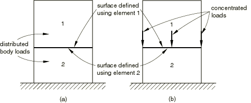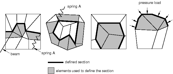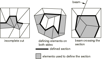![]() Input File Usage Use both of the following options: INTEGRATED OUTPUT SECTION, NAME=section_name, SURFACE=surface_name INTEGRATED OUTPUT, SECTION=section_name Abaqus/CAE Usage Step module: Name: section_name: select regions for the surface: History output request editor: Domain: Integrated output section: section_name Requesting integrated output for “force-flow” studiesTo study the “force-flow” through various paths in a model, you must create interior surfaces that cut through one or more regions (similar to a cross-section) so that you can request integrated output of the total force transmitted across these surfaces. You can create such interior surfaces over the element facets, edges, or ends by simply cutting through one or more regions of the model with a plane; see Creating interior cross-section surfaces for more information. Input File Usage Use both of the following options: SURFACE, NAME=surface_name, TYPE=CUTTING SURFACE INTEGRATED OUTPUT, SURFACE=surface_name Abaqus/CAE Usage You cannot specify the surface for an integrated output request directly in Abaqus/CAE; you must create an integrated output section as described above. Requesting integrated output over an element set in Abaqus/ExplicitYou can request integrated output over an element set to output its total mass, the percentage change of its total mass, its average rigid body motion or any combination of these variables. The element set must have been defined previously, and it can include any type of elements. Input File Usage Use the following option to request integrated output over an element set: INTEGRATED OUTPUT, ELSET=element set name Abaqus/CAE Usage Requesting integrated output over an element set is not supported in Abaqus/CAE. Controlling the output frequencyThe frequency of integrated output is controlled as described above in Controlling the output frequency. Requesting preselected outputPreselected output variables are available only when the integrated output is requested over a surface. If integrated output is requested over an element set, you must specify the variables on the data line. If the integrated output is requested over a surface, you can request the preselected integrated output variables SOF and SOM. In this case you can also specify additional variables as part of the output request. Alternatively, you can request all integrated variables applicable to the current procedure type. In this case any additional variables that you specify are ignored. If you do not request the preselected variables or all variables, you must specify the variables individually. Input File Usage Use the following option to request the preselected integrated output variables: INTEGRATED OUTPUT, VARIABLE=PRESELECT optional additional variables Use the following option to request all integrated output variables relevant to the current procedure type: INTEGRATED OUTPUT, VARIABLE=ALL Use the following option to specify individual integrated output variables: INTEGRATED OUTPUT individual variables Abaqus/CAE Usage Step module: history output request editor: Preselected defaults or All Limitations when using integrated output requestsIntegrated output requests over a surface are subject to the following limitations: