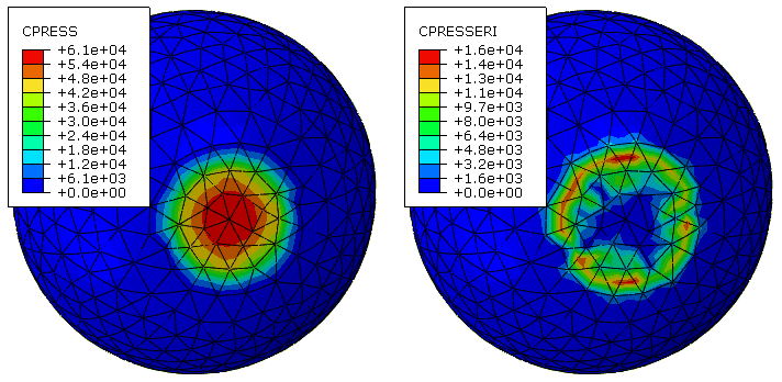 The analyst may judge that the level of mesh refinement is adequate if the maximum contact pressure is of primary interest in such a case. Local mesh refinement would be needed to accurately predict the maximum contact pressure if the active contact region was significantly smaller than that shown in Figure 1. Figure 1. Contour plots of CPRESS and CPRESSERI for contact between a deformable sphere and a rigid