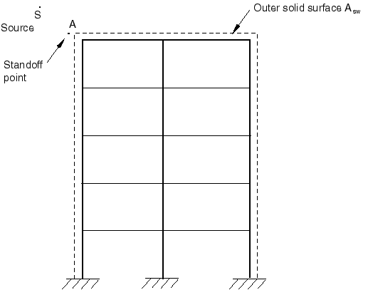 In problems with a fluid-solid interface both surfaces must be specified in the incident wave loading definition for the scattered formulation. See Example: submarine close to the free surface, shown in Figure 4. When the total pressure-based formulation is specified, the incident wave loading must be specified only on the fluid surfaces that border the infinite region that is excluded from the model. Typically, these surfaces have a nonreflecting radiation condition specified on them, and the implementation ensures that the radiation condition is enforced only on the scattered response of the modeled domain and not on the incident wave itself. See Example: submarine close to the free surface and Example: surface ship, shown in Figure 4 and Figure 5, respectively. In certain problems, such as blast loads in air, you may decide that the blast wave loads on a structure need to be modeled, but the surrounding fluid medium itself does not. In these problems the incident wave loading is specified only on the solid surfaces since the fluid medium is not modeled. The distinction between the scattered wave formulation and the total wave formulation for handling the incident wave loading is not relevant in these problems since the wave propagation in the fluid medium is of no interest. The standoff pointIn transient analyses the standoff point is a reference point used to specify the pulse loading time history: it is the point at which the user-defined pulse history is assumed to apply with no time delay, phase shift, or spreading loss. In steady-state analyses using discrete planar or spherical sources, the standoff point is the point at which the incident field has zero phase. In transient analyses the standoff point should be defined so that it is closer to the source than any point on the surfaces in the model that would reflect the incident wave. Doing so ensures that all the points on these surfaces will be loaded with the specified time history of the source and that the analysis begins before the wave overtakes any portion of these surfaces. To save analysis time, the standoff point is typically on or near the solid surface where the incoming incident wave would be first deflected (see Example: submarine close to the free surface, shown in Figure 4). However, the standoff point is a fixed point in the analysis: if the loaded surfaces move before the incident wave loading begins, due to previous analysis steps or geometric adjustments, the surfaces may envelop the specified standoff point. Care should be taken to define a standoff point such that it remains closer to the incident wave source point than any point on the loaded surfaces at the onset of the loading. When the total wave formulation is used and the incident wave loading is specified in the first step of the analysis in terms of pressure history, Abaqus automatically initializes the pressure and the pressure rate at the acoustic nodes to values based on the incident wave loading. This allows the acoustic analysis to start with the incident waves partially propagated into the problem domain at time zero and assumes that this propagation had taken place with negligible effect of any volumetric dissipative sources such as the fluid drag. When the incident wave loading is specified in terms of the pressure values, the recommendations given above for selecting a standoff point are valid with the total wave formulation as well. However, when the incident wave loading is specified in terms of acceleration values, the automatic initialization is not done and the standoff point should be located near the exterior fluid boundary of the model such that the standoff point is closer to the source than any point on the exterior boundary. See Example: submarine close to the free surface and Example: surface ship, shown in Figure 4 and Figure 5, respectively. In steady-state analyses the role of the standoff point is somewhat different. When the incident wave interaction property is of planar or spherical type, you define the real and imaginary parts of the magnitude at the standoff point. Separately, the specified real and imaginary incident waves are taken to have zero phase at the standoff point (combined, these two waves could be equivalent to a single wave with nonzero phase at the standoff). Every location on the loaded surface has a phase shift in the applied pressure or acoustic traction, corresponding to the difference in propagation time between the loaded point and the standoff. This means that an incident wave defined, for example, with a pure real value at the standoff point generates both real and imaginary tractions at all the other points on the loaded surface. When the incident wave is of diffuse type, the role of the standoff and source points is primarily to orient the loaded surface with respect to the incoming reverberant field. The model used for diffuse incident wave loading applies a set of deterministically defined plane waves, whose directions are defined as vectors connecting the standoff point and an array of points on a hemisphere. This hemisphere is centered at the standoff point, and its apex is the source point. The array of points is set according to the specified seed, , and a deterministic algorithm that arranges points on the hemisphere. The algorithm concentrates the points so that the incident waves in the diffuse field model are concentrated at normal incidence, with fewer waves at oblique angles. The specified amplitude value and reference magnitude are divided equally among the incident waves. The orientation of the hemisphere containing the incident waves in the diffuse model is the same for all of the points on the loaded surface—it does not vary with the local normal vector on the surface. Defining the amplitude of the source pulseFor transient analyses the time history to be specified by the user is that observed at the standoff point: histories at a point on the loaded surface are computed from th