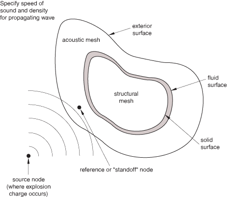 ![]() Since the stiffness and inertia of the air medium are negligible, the acoustic medium is not modeled. Rather the incident wave loading is applied directly on the structure itself. The solid surface where the incident wave loading is applied is shown in Figure 6. Since the acoustic medium is not modeled, the total wave and the scattered wave formulations are identical. Example: fluid cavitation without incident wave loadingYou may be interested in modeling acoustic problems in Abaqus/Explicit where the loading is applied through either prescribed pressure boundaries or specified pressure-conjugate concentrated loads. Choice of the scattered or the total wave formulation is not relevant in these problems even when the acoustic medium is capable of cavitation. |