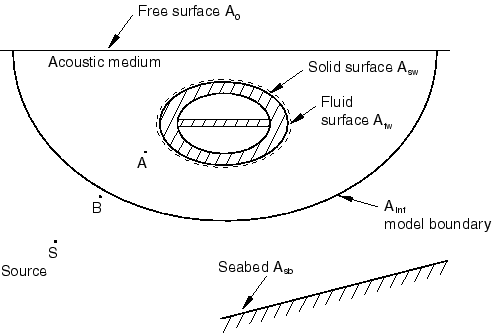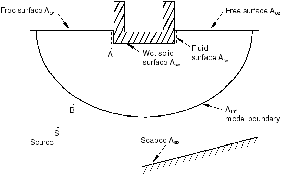 ![]() Scattered wave solutionHere the scattered wave response in the acoustic medium is of interest along with that of the structure to the incident wave loading. Cavitation in the fluid is not considered in a scattered wave formulation. Similarly, the initial hydrostatic pressure in the fluid is not modeled. The zero dynamic acoustic pressure boundary condition on the free surface requires both a “soft” reflection plane coinciding with the free surface and a zero scattered pressure boundary condition at the nodes on this free surface. The incident wave loading is applied on the fluid surface, , and on the wet solid surface, . The incident wave loading can be only of pressure amplitude type since the loading includes a solid surface. A good location for the standoff node is marked as A in Figure 4. This node is in the fluid, close to the structure, and closer to incident wave source S than any portion of the seabed or the free surface. The standoff node's offset from the loaded surfaces is exaggerated for emphasis in the figure. The radiation condition is specified on the acoustic surface such that the scattered wave impinging on this boundary with the infinite medium does not reflect back into the computational domain. The seabed is modeled with an incident wave reflection plane on surface . The reflection loss at this seabed surface is modeled using an impedance property. If the response of the structure in the nonlinear regime is of interest, the initial stress state in the structure should be established using Abaqus/Standard in a static analysis. The stress state in the structure is then imported into Abaqus/Explicit, and the loading on the solid surfaces causing the initial stress state is respecified in the acoustic analysis. The following template schematically shows some of the Abaqus input file options that are used to solve this problem using the scattered wave formulation: HEADING … SURFACE, NAME= Data lines to define the acoustic surface that is wetting the solid SURFACE, NAME= Data lines to define the solid surface that is wetted by the fluid SURFACE, NAME= Data lines to define the acoustic surface separating the modeled region from the infinite medium INCIDENT WAVE INTERACTION PROPERTY, NAME=IWPROP AMPLITUDE, DEFINITION=TABULAR, NAME=PRESSUREVTIME TIE, NAME=COUPLING , STEP ** For an Abaqus/Standard analysis: DYNAMIC ** For an Abaqus/Explicit analysis: DYNAMIC, EXPLICIT ** Load the acoustic surface INCIDENT WAVE INTERACTION, PRESSURE AMPLITUDE=PRESSUREVTIME, PROPERTY=IWPROP , source node, standoff node, reference magnitude INCIDENT WAVE REFLECTION Data lines for the reflection plane over the seabed , seabed_Q INCIDENT WAVE REFLECTION Data lines for a "soft" reflection plane over the free surface . ** Load the solid surface INCIDENT WAVE INTERACTION, PRESSURE AMPLITUDE=PRESSUREVTIME, PROPERTY=IWPROP , source node, standoff node, reference magnitude INCIDENT WAVE REFLECTION Data lines for the reflection plane over the seabed , seabed_Q INCIDENT WAVE REFLECTION Data lines for a "soft" reflection plane over the free surface . BOUNDARY ** zero pressure boundary condition on the free surface Set of nodes on the free surface , 8, 8, 0.0 SIMPEDANCE , END STEP Total wave solutionHere the total wave response in the acoustic medium is of interest along with that of the structure to the incident wave loading. Cavitation in the fluid may be included. Similarly, a linearly varying initial hydrostatic pressure in the fluid can be specified. The zero dynamic acoustic pressure boundary condition on the free surfaces requires only a zero pressure boundary condition at the nodes on this free surface. A reflection plane should not be included along the free surface. The incident wave loading is applied only on the fluid surface, , that separates the modeled region from the surrounding infinite acoustic medium. No incident wave should be applied directly on the structure surfaces. If the incident wave is considered planar, an acceleration-type amplitude can be used with the incident wave loading. Otherwise, a pressure-type amplitude must be used with the incident wave loading. An ideal location for the standoff node depends on the type of amplitude used for the time history of the incident wave loading. The location A shown in Figure 4 can be used if the incident wave loading time history is of pressure amplitude type. Otherwise, the location B that is just on the boundary and closer to the source S than any part of either the seabed or the free surface can be used. The nonreflecting impedance condition is specified on the acoustic surface, , such that the scattered part of the total wave impinging on this boundary with the infinite medium does not reflect back into the computational domain. The seabed is modeled with an incident wave reflection plane on the surface . If the response of the structure in the nonlinear regime is of interest, the initial stress state in the structure should be established using Abaqus/Standard in a static analysis. The stress state in the structure is then imported into Abaqus/Explicit, and the loading on the solid surfaces causing the initial stress state is respecified in the acoustic analysis. The following template schematically shows some of the input file options that are used to solve this problem using the total wave formulation: HEADING … ACOUSTIC WAVE FORMULATION, TYPE=TOTAL WAVE MATERIAL, NAME=CAVITATING_FLUID ACOUSTIC MEDIUM, BULK MODULUS Data lines to define the fluid bulk modulus ACOUSTIC MEDIUM, CAVITATION LIMIT Data lines to define the fluid cavitation limit … SURFACE, NAME= Data lines to define the acoustic surface that is wetting the solid SURFACE, NAME= Data lines to define the solid surface that is wetted by the fluid SURFACE, NAME= Data lines to define the acoustic surface separating the modeled region from the infinite medium INCIDENT WAVE INTERACTION PROPERTY, NAME=IWPROP AMPLITUDE, DEFINITION=TABULAR, NAME=PRESSUREVTIME Data lines