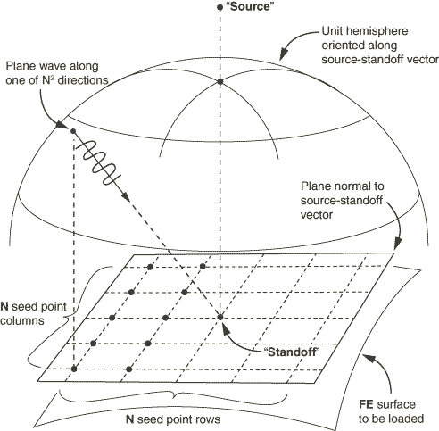 Two interfaces are available in Abaqus for applying incident wave loads: a preferred interface that is supported in Abaqus/CAE and an alternative interface that has been available in previous releases and is not supported in Abaqus/CAE. The preferred interface is conceptually the same as the alternative interface and uses essentially the same data. The preferred interface options include the term “interaction” to distinguish them from the incident wave and incident wave property options of the alternative interface. Unless otherwise specified, the discussion in this section applies to both of the interfaces. The usages for the preferred interface are included in the discussion; the usages for the alternative interface are described in Alternative incident wave loading interface below. Refer to the example problems discussed at the end of this section to see how the incident wave loading is specified using the preferred interface. Prescribing geometric properties and the speed of the incident waveYou must refer to a property definition for each prescribed incident wave. Incident wave loads in Abaqus may be either planar, spherical, or diffuse. You select a planar incident wave (default), spherical incident wave, or a diffuse field in the incident wave property definition. Planar incident waves maintain constant amplitude as they travel in space; consequently, the speed and direction of travel are the critical parameters to define. The speed is defined in the incident wave interaction property definition, and the direction is determined by the locations of the source and standoff points you define as part of the incident wave interaction. For spherical incident wave definitions, the wave reduces in amplitude as a function of space. By default, the amplitude of a spherical wave is inversely proportional to the distance from the source; this behavior is called “acoustic” propagation. For the preferred interface you can modify the default propagation behavior to define spatial decay of the incident wave field. The dimensionless constants , , and are used to define the spatial decay as a function of the distance between the source point and the loaded point and the distance between the source point and the standoff point: Refer to Loading due to an incident dilatational wave field for details of the generalized spatial decay formulation. In Abaqus incident wave interactions can be used to simulate diffuse incident fields. Diffuse fields are characteristic of reverberant spaces or other situations in which waves from many directions strike a surface. For example, reverberant chambers are constructed intentionally in acoustic test facilities for sound transmission loss measurements. The diffuse field model used in Abaqus, as shown in Figure 2, allows you to specify a seed number ; deterministic incident plane waves travel along vectors distributed over a hemisphere so that the incident power per solid angle approximates a diffuse incident field. Figure 2. Diffuse loading model.