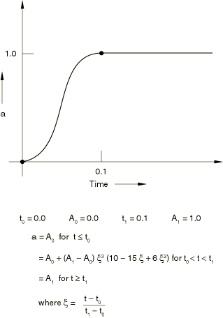 ![]() Defining smooth step dataAbaqus/Standard and Abaqus/Explicit can calculate amplitudes based on smooth step data. Choose the smooth step definition method to define the amplitude, a, between two consecutive data points and as where . The above function is such that at , at , and the first and second derivatives of a are zero at and . This definition is intended to ramp up or down smoothly from one amplitude value to another. The amplitude, a, is defined such that where and are the first and last data points, respectively. Examples of this form of input are shown in Figure 5 and Figure 6. This definition cannot be used to interpolate smoothly between a set of data points; i.e., this definition cannot be used to do curve fitting. Input File Usage AMPLITUDE, NAME=name, DEFINITION=SMOOTH STEP Abaqus/CAE Usage Load or Interaction module: Create Amplitude: Smooth step Figure 5. Smooth step amplitude definition example with two data points.