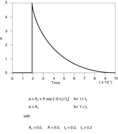 ![]() Defining exponential decayChoose the exponential decay definition method to define the amplitude, a, as where , A, , and are user-defined constants. An example of this form of input is shown in Figure 4. Input File Usage AMPLITUDE, NAME=name, DEFINITION=DECAY Abaqus/CAE Usage Load or Interaction module: Create Amplitude: Decay Figure 4. Exponential decay amplitude definition example.