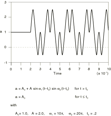 ![]() Defining modulated dataChoose the modulated definition method to define the amplitude, a, as where , A, , , and are user-defined constants. An example of this form of input is shown in Figure 3. Input File Usage AMPLITUDE, NAME=name, DEFINITION=MODULATED Abaqus/CAE Usage Load or Interaction module: Create Amplitude: Modulated Figure 3. Modulated amplitude definition example.