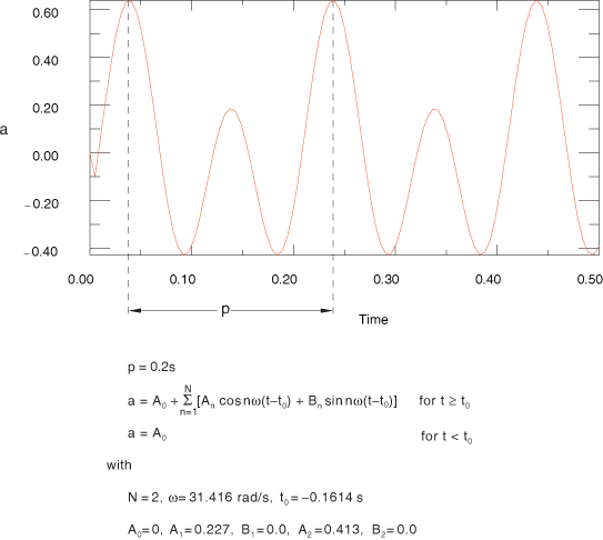 ![]() Defining equally spaced dataChoose the equally spaced definition method to give a list of amplitude values at fixed time intervals beginning at a specified value of time. Abaqus interpolates linearly between each time interval. You must specify the fixed time (or frequency) interval at which the amplitude data will be given, . You can also specify the time (or lowest frequency) at which the first amplitude is given, ; the default is =0.0. If the analysis time in a step is less than the earliest time for which data exist in the table, Abaqus applies the earliest value in the table for all step times less than the earliest tabulated time. Similarly, if the analysis continues for step times past the last time for which data are defined in the table, the last value in the table is applied for all subsequent time. Input File Usage AMPLITUDE, NAME=name, DEFINITION=EQUALLY SPACED, FIXED INTERVAL=, BEGIN= Abaqus/CAE Usage Load or Interaction module: Create Amplitude: Equally spaced: Fixed interval: The time (or lowest frequency) at which the first amplitude is given, , is indicated in the first table cell. Defining periodic dataChoose the periodic definition method to define the amplitude, a, as a Fourier series: where , N, , , , and , , are user-defined constants. An example of this form of input is shown in Figure 2. Input File Usage AMPLITUDE, NAME=name, DEFINITION=PERIODIC Abaqus/CAE Usage Load or Interaction module: Create Amplitude: Periodic Figure 2. Periodic amplitude definition example.