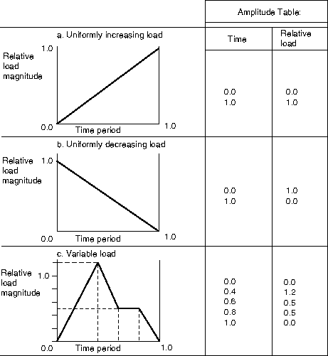 Specifying relative or absolute dataYou can choose between specifying relative or absolute magnitudes for an amplitude curve. Relative dataBy default, you give the amplitude magnitude as a multiple (fraction) of the reference magnitude given in the prescribed condition definition. This method is especially useful when the same variation applies to different load types. Input File Usage AMPLITUDE, NAME=name, VALUE=RELATIVE Abaqus/CAE Usage Amplitude magnitudes are always relative in Abaqus/CAE. Absolute dataAlternatively, you can give absolute magnitudes directly. When this method is used, the values given in the prescribed condition definitions will be ignored. Absolute amplitude values should generally not be used to define temperatures or predefined field variables for nodes attached to beam or shell elements as values at the reference surface together with the gradient or gradients across the section (default cross-section definition; see Using a beam section integrated during the analysis to define the section behavior and Using a shell section integrated during the analysis to define the section behavior). Because the values given in temperature fields and predefined fields are ignored, the absolute amplitude value will be used to define both the temperature and the gradient and field and gradient, respectively. Input File Usage AMPLITUDE, NAME=name, VALUE=ABSOLUTE Abaqus/CAE Usage Absolute amplitude magnitudes are not supported in Abaqus/CAE. Defining the amplitude dataThe variation of an amplitude with time can be specified in several ways. The variation of an amplitude with frequency can be given only in tabular or equally spaced form. Defining tabular dataChoose the tabular definition method (default) to define the amplitude curve as a table of values at convenient points on the time scale. Abaqus interpolates linearly between these values, as needed. By default in Abaqus/Standard, if the time derivatives of the function must be computed, some smoothing is applied at the time points where the time derivatives are discontinuous. In contrast, in Abaqus/Explicit no default smoothing is applied (other than the inherent smoothing associated with a finite time increment). You can modify the default smoothing values (smoothing is discussed in more detail below, under the heading “Using an amplitude definition with boundary conditions”); alternatively, a smooth step amplitude curve can be defined (see “Defining smooth step data” below). If the amplitude varies rapidly—as with the ground acceleration in an earthquake, for example—you must ensure that the time increment used in the analysis is small enough to pick up the amplitude variation accurately since Abaqus will sample the amplitude definition only at the times corresponding to the increments being used. If the analysis time in a step is less than the earliest time for which data exist in the table, Abaqus applies the earliest value in the table for all step times less than the earliest tabulated time. Similarly, if the analysis continues for step times past the last time for which data are defined in the table, the last value in the table is applied for all subsequent time. Several examples of tabular input are shown in Figure 1. Input File Usage AMPLITUDE, NAME=name, DEFINITION=TABULAR Abaqus/CAE Usage Load or Interaction module: Create Amplitude: Tabular Figure 1. Tabular amplitude definition examples.