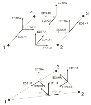 ![]() The forces per unit length in the global directions on beam elements are always non-follower loads. General edge tractions can be specified to be follower or non-follower loads. There is no difference between a follower and a non-follower load in a geometrically linear analysis since the configuration of the body remains fixed. Input File Usage Use one of the following options to define general edge tractions as follower loads (the default): DLOAD, FOLLOWER=YES DSLOAD, FOLLOWER=YES Use one of the following options to define general edge tractions as non-follower loads: DLOAD, FOLLOWER=NO DSLOAD, FOLLOWER=NO Abaqus/CAE Usage Load module: Create Load: choose Mechanical for the Category and Shell edge load for the Types for Selected Step: Traction: General, toggle on or off Follow rotation Specifying general edge tractionsGeneral edge tractions allow you to specify an edge load, , acting on a shell edge, L. The resultant load, , is computed by integrating over L: To define a general edge traction, you must provide both a magnitude, , and direction, , for the load. The specified load directions are normalized by Abaqus; thus, they do not contribute to the magnitude of the load. If a nonuniform general edge traction is specified, the magnitude, , and direction, , must be specified in user subroutine UTRACLOAD. Input File Usage Use one of the following options to define a general edge traction: DLOAD element number or element set, EDLDn or EDLDnNU, magnitude, direction components DSLOAD surface name, EDLD or EDLDNU, magnitude, direction components Abaqus/CAE Usage Use the following input to define an element-based general edge traction: Load module: Create Load: choose Mechanical for the Category and Shell edge load for the Types for Selected Step: Traction: General, Distribution: select an analytical field Use the following input to define a surface-based general edge traction: Load module: Create Load: choose Mechanical for the Category and Shell edge load for the Types for Selected Step: Traction: General, Distribution: Uniform or User-defined Nonuniform element-based general edge traction is not supported in Abaqus/CAE. Rotation of the load vectorIn a geometrically linear analysis the edge load, , acts in the fixed direction defined by If a non-follower load is specified in a geometrically nonlinear analysis (which includes a perturbation step about a geometrically nonlinear base state), the edge load, , acts in the fixed direction defined by If a follower load is specified in a geometrically nonlinear analysis (which includes a perturbation step about a geometrically nonlinear base state), the components must be defined with respect to the reference configuration. The reference edge traction is defined as The applied edge traction, , is computed by rigidly rotating onto the current edge. Defining the direction vector with respect to a local coordinate systemBy default, the components of the edge traction vector are specified with respect to the global directions. You can also refer to a local coordinate system (see Orientations) for the direction components of these tractions. Input File Usage Use one of the following options to specify a local coordinate system: DLOAD, ORIENTATION=name DSLOAD, ORIENTATION=name Abaqus/CAE Usage Load module: Create Load: choose Mechanical for the Category and Shell edge load for the Types for Selected Step: select CSYS: Picked and click to pick a local coordinate system, or select CSYS: User-defined to enter the name of a user subroutine that defines a local coordinate system Specifying shear, normal, and transverse edge tractionsThe loading directions of shear, normal, and transverse edge tractions are determined by the underlying elements. A positive shear edge traction acts in the positive direction of the shell edge as determined by the element connectivity. A positive normal edge traction acts in the plane of the shell in the inward direction. A positive transverse edge traction acts in a sense opposite to the facet normal. The directions of positive shear, normal, and transverse edge tractions are shown in Figure 6. To define a shear, normal, or transverse edge traction, you must provide a magnitude, for the load. If a nonuniform shear, normal, or transverse edge traction is specified, the magnitude, , must be specified in user subroutine UTRACLOAD. In a geometrically linear step, the shear, normal, and transverse edge tractions act in the tangential, normal, and transverse directions of the shell, as shown in Figure 6. In a geometrically nonlinear analysis the shear, normal, and transverse edge tractions rotate with the shell edge so they always act in the tangential, normal, and transverse directions of the shell, as shown in Figure 6. Input File Usage Use one of the following options to define a directed edge traction: DLOAD element number or element set, directed edge traction label, magnitude DSLOAD surface name, directed edge traction label, magnitude For element-based loads the directed edge traction label can be EDSHRn or EDSHRnNU for shear edge tractions, EDNORn or EDNORnNU for normal edge tractions, or EDTRAn or EDTRAnNU for transverse edge tractions. For surface-based loads the directed edge traction label can be EDSHR or EDSHRNU for shear edge tractions, EDNOR or EDNORNU for normal edge tractions, or EDTRA or EDTRANU for transverse edge tractions. Abaqus/CAE Usage Use the following input to define an element-based directed edge traction: Load module: Create Load; choose Mechanical for the Category and Shell edge load for the Types for Selected Step; Traction: Normal, Transverse, or Shear; Distribution: select an analytical field Use the following input to define a surface-based directed edge traction: Load module: Create Load; choose Mechanical for the Category and Shell edge load for the Types for Selected Step; Traction: Normal, Transverse, or Shear; Distribution: Uniform or User-defined Nonuniform element-based directed edge trac