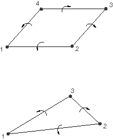 Follower surface loadsBy definition, the line of action of a follower surface load rotates with the surface in a geometrically nonlinear analysis. This is in contrast to a non-follower load, which always acts in a fixed global direction. With the exception of general surface tractions, all the distributed surface loads listed in Table 5 and Table 6 are modeled as follower loads. The hydrostatic and viscous pressures listed in Table 5 and Table 6 always act normal to the surface in the current configuration, the shear tractions always act tangent to the surface in the current configuration, and the internal and external pipe pressures follow the motion of the pipe elements. General surface tractions can be specified to be follower or non-follower loads. There is no difference between a follower and a non-follower load in a geometrically linear analysis since the configuration of the body remains fixed. The difference between a follower and non-follower general surface traction is illustrated in the next section through an example. Input File Usage Use one of the following options to define general surface tractions as follower loads (the default): DLOAD, FOLLOWER=YES DSLOAD, FOLLOWER=YES Use one of the following options to define general surface tractions as non-follower loads: DLOAD, FOLLOWER=NO DSLOAD, FOLLOWER=NO Abaqus/CAE Usage Load module: Create Load: choose Mechanical for the Category and Surface traction for the Types for Selected Step: Traction: General, toggle on or off Follow rotation Specifying general surface tractionsGeneral surface tractions allow you to specify a surface traction, , acting on a surface S. The resultant load, , is computed by integrating over S: where is the magnitude and is the direction of the load. To define a general surface traction, you must specify both a load magnitude, , and the direction of the load with respect to the reference configuration, . The magnitude and direction can also be specified in user subroutine UTRACLOAD. The specified traction directions are normalized by Abaqus and, thus, do not contribute to the magnitude of the load: Input File Usage Use one of the following options to define a general surface traction: DLOAD element number or element set, load type label, magnitude, direction components where load type label is TRVECn, TRVEC, TRVECnNU, or TRVECNU. DSLOAD surface name, TRVEC or TRVECNU, magnitude, direction components Abaqus/CAE Usage Use the following input to define an element-based general surface traction: Load module: Create Load: choose Mechanical for the Category and Surface traction for the Types for Selected Step: Traction: General, Distribution: select an analytical field Use the following input to define a surface-based general surface traction: Load module: Create Load: choose Mechanical for the Category and Surface traction for the Types for Selected Step: Traction: General, Distribution: Uniform or User-defined Nonuniform element-based general surface traction is not supported in Abaqus/CAE. Defining the direction vector with respect to a local coordinate systemBy default, the components of the traction vector are specified with respect to the global directions. You can also refer to a local coordinate system (see Orientations) for the direction components of these tractions. See Examples: using a local coordinate system to define shear directions below for an example of a traction load defined with respect to a local coordinate system. When using local coordinate systems for tractions applied to two-dimensional solid elements, you must ensure that the nonzero components of the loads are applied only in the X- and Y-directions. Tractions loads in the third direction are not supported (Z-direction for plane strain and plane stress elements, -direction for axisymmetric elements). Input File Usage Use one of the following options to specify a local coordinate system: DLOAD, ORIENTATION=name DSLOAD, ORIENTATION=name Abaqus/CAE Usage Load module: Create Load: choose Mechanical for the Category and Surface traction for the Types for Selected Step: select CSYS: Picked and click to pick a local coordinate system, or select CSYS: User-defined to enter the name of a user subroutine that defines a local coordinate system Rotation of the traction vector directionThe traction load acts in the fixed direction in a geometrically linear analysis or if a non-follower load is specified in a geometrically nonlinear analysis (which includes a perturbation step about a geometrically nonlinear base state). If a follower load is specified in a geometrically nonlinear analysis, the traction load rotates rigidly with the surface using the following algorithm. The reference configuration traction vector, , is decomposed by Abaqus into two components: a normal component, and a tangential component, where is the unit reference surface normal and is the unit projection of onto the reference surface. The applied traction in the current configuration is then computed as where is the normal to the surface in the current configuration and is the image of rotated onto the current surface; i.e., , where is the standard rotation tensor obtained from the polar decomposition of the local two-dimensional surface deformation gradient . Examples: follower and non-follower tractionsThe following two examples illustrate the difference between applying follower and non-follower tractions in a geometrically nonlinear analysis. Both examples refer to a single 4-node plane strain element (element 1). In Step 1 of the first example a follower traction load is applied to face 1 of element 1, and a non-follower traction load is applied to face 2 of element 1. The element is rotated rigidly 90° counterclockwise in Step 1 and then another 90° in Step 2. As illustrated in Figure 1, the follower traction rotates with face 1, while the non-follower traction on face 2 always acts in the global x-direction. Figure 1. Follower and non-follower traction loads in a g