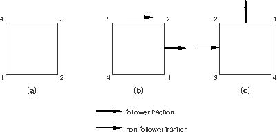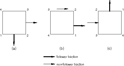 ![]() STEP, NLGEOM Step 1 - Rotate square 90 degrees ... DLOAD, FOLLOWER=YES 1, TRVEC1, 1., 0., -1., 0. DLOAD, FOLLOWER=NO 1, TRVEC2, 1., 1., 0., 0. END STEP STEP, NLGEOM Step 2 - Rotate square another 90 degrees ... END STEP In the second example the element is rotated 90° counterclockwise with no load applied in Step 1. In Step 2 a follower traction load is applied to face 1, and a non-follower traction load is applied to face 2. The element is then rotated rigidly by another 90°. The direction of the follower load is specified with respect to the original configuration. As illustrated in Figure 2, the follower traction rotates with face 1, while the non-follower traction on face 2 always acts in the global x-direction. Figure 2. Follower and non-follower traction loads in a geometrically