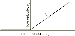 Figure 1 illustrates this pore pressure–velocity relationship. This surface condition is designed for use with the total pore pressure formulation (see Coupled pore fluid diffusion and stress analysis), mainly for cases where the phreatic surface intersects an exterior surface that is free to drain. See Calculation of phreatic surface in an earth dam for an example of this type of calculation. Figure 1. Drainage-only pore pressure–velocity relationship.
