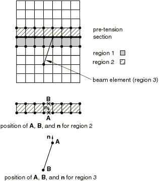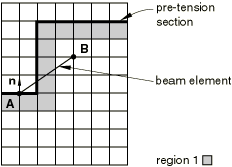 ![]() For each region other than region 1 an additional step is necessary to determine on which side of the section the region is located. Abaqus/Standard computes an average normal, , for all the nodes of the region that belong to the section; it also computes an average position () of all these nodes. In addition, it computes an average position () of the remaining nodes of the region. If the dot product between the normal and the vector is negative, the region is assumed to be an underlying region and is added to region 1. This additional step is illustrated in Figure 5 for regions 2 and 3. This additional step produces an incorrect separation for the beam element shown in Figure 6 since the beam is not found to be an underlying element. Figure 6. An additional underlying element is not found.