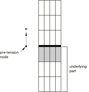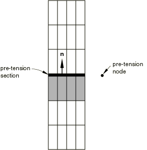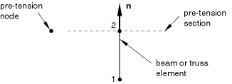![]() If the pre-tension section has an odd shape and one or more line elements that cross over element boundaries are connected to it, consult the list of the underlying elements given in the data (.dat) file to make sure that the underlying elements are listed correctly. Elements that are connected only to the nodes on the pre-tension section, including single-node elements (such as SPRING1, DASHPOT1, and MASS elements) are not included as underlying elements: they are considered to be attached to the other side of the section. Modeling a fastener with truss or beam elementsWhen a pre-tensioned component is modeled with truss or beam elements, the pre-tension section is reduced to a point. The section is assumed to be located at the last node of the element as defined by the element connectivity (see Beam element library and Truss element library for a definition of the node ordering for beam and truss elements, respectively), with its normal along the element directed from the first to the last node. As a result, the section is defined entirely by just specifying the element to which an assembly load must be prescribed and associating it with a pre-tension node. Input File Usage Use the following option to model an assembly load across fasteners modeled with beam or truss elements: PRE-TENSION SECTION, ELEMENT=element_number, NODE=n Abaqus/CAE Usage Load module: Create Load: choose Mechanical for the Category and Bolt load for the Types for Selected Step As in the case of a surface-based pre-tension section, the node has only one degree of freedom (degree of freedom 1), which represents the relative displacement on the two sides of the cut in the direction of the normal (see Figure 7). The coordinates of the node are not important. Figure 7. Pre-tension section defined using a truss or beam element.