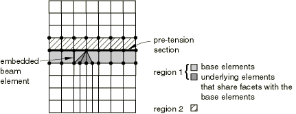 ![]() Defining the normal to the pre-tension sectionAbaqus/Standard computes an average normal to the section—in the positive surface direction, facing away from the continuum elements used to generate the surface—to determine the direction along which the pre-tension is applied. You may also specify the normal directly (when the desired direction of loading is different from the average normal to the pre-tension section). The normal is not updated when performing large-displacement analysis. Recognizing elements on either side of the pre-tension sectionFor all the elements that are connected to the pre-tension section by at least one node, Abaqus/Standard must determine on which side of the pre-tension section each element is located. This process is crucial for the prescribed assembly load to work properly. The elements used to define the section are referred to as “base elements” in this discussion. All elements on the same side of the section as the base elements are referred to as the “underlying elements.” All elements connected to the section that share faces (or in two-dimensional problems, edges) with the base elements are added to the list of underlying elements. This is a repetitive process that enables Abaqus/Standard to find the underlying elements in almost all meshes—triangles; wedges; tetrahedra; and embedded beams, trusses, shells, and membranes—that were not used in the definition of the surface (see Figure 4). Figure 4. The base elements are used to find the underlying elements.