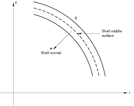 ProductsAbaqus/StandardAbaqus/Explicit These two shell elements are axisymmetric versions of the shells described in About the Abaqus shell element library and use the “reduced-integration penalty” method of Hughes et al. (1977). While these are shell elements, they are also simple extensions of the two-dimensional beam elements B21 and B22. The extension is the inclusion of the hoop terms. These elements are thus one-dimensional, deforming in a radial plane. The Cartesian coordinates in this plane are r (radius) and z (axial position). Distance along the shell reference surface in such a plane is measured by the material coordinate S (see Figure 1). Figure 1. Axisymmetric shell.