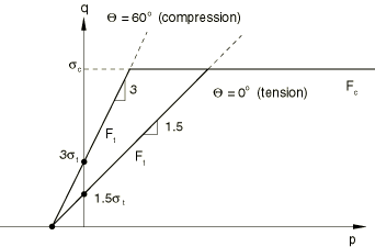 ProductsAbaqus/StandardAbaqus/Explicit In tension gray cast iron is more brittle than most metals. This brittleness is attributed to the microstructure of the material, which consists of a distribution of graphite flakes in a steel matrix. In tension the graphite flakes act as stress concentrators, leading to an overall decrease in mechanical properties (such as yield strength). In compression, on the other hand, the graphite flakes serve to transmit stresses, and the overall response is governed by the response of the steel matrix alone. The above differences manifest themselves in the following macroscopic properties: (i) different yield strengths in tension and compression, with the yield stress in compression being a factor of three or more higher than the yield stress in tension; (ii) inelastic volume change in tension, but little or no inelastic volume change in compression; and (iii) different hardening behavior in tension and compression. It is commonly accepted (Hjelm, 1992, 1994) that a Mises-type yield condition along with an associated flow rule models the material response sufficiently accurately under compressive loading conditions. This assumption is not true for tensile loading conditions: a pressure-dependent yield surface with nonassociated flow is required to model the brittle behavior in tension. The model is described in detail in the remainder of this section. Strain rate decompositionAn additive strain rate decomposition is assumed: where is the total strain rate, is the elastic part of the strain rate, and is the inelastic (plastic) part of the strain rate. Elastic behaviorIn compression the elastic behavior of gray cast iron is similar to that of many steels. It shows a well-defined elastic stiffness. In uniaxial tension the slope of the stress/strain curve decreases continuously, and it is difficult to estimate the elastic modulus from experimental results. The model in Abaqus assumes that the elastic behavior of gray cast iron can be represented by linear isotropic elasticity, with the same stiffness in tension and compression. Yield conditionThe model makes use of a composite yield surface to describe the different behavior in tension and compression. In tension yielding is assumed to be governed by the maximum principal stress, while in compression yielding is assumed to be pressure-independent and governed by the deviatoric stresses alone. In principal stress space the composite yield surface consists of the Rankine cube in tension and the Mises cylinder in compression. The material is assumed to be isotropic; hence, the yield surface can be expressed as a function of three invariant measures of the stress tensor: the equivalent pressure stress, the Mises equivalent stress, and the third invariant of the deviatoric stress, where is the stress deviator, defined as is the Cauchy stress tensor, and is the second-order identity tensor. It is convenient to combine the invariants q and r to define a nondimensional quantity, , where In principal stress space the variable identifies the meridional plane for a given stress state. On any given meridional plane the yield surface consists of two distinct line segments given by and In the expressions above ; is the yield stress in uniaxial tension, which may depend on the equivalent plastic strain in uniaxial tension , temperature , and field variables (); and is the yield stress in uniaxial compression, which may depend on the equivalent plastic strain in uniaxial compression , temperature , and field variables (). The composite yield surface is illustrated in the meridional plane in Figure 1, in the deviatoric plane in Figure 2, and in the principal stress space in Figure 3. Figure 1. Schematic of the yield surface in the meridional plane.