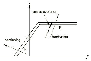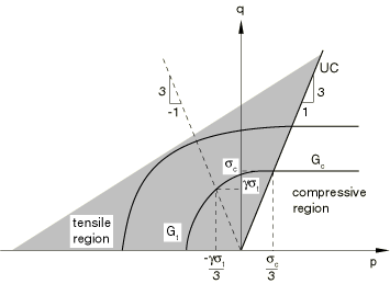 ![]() Flow ruleFor the purposes of discussing the flow and hardening behavior, it is useful to divide a meridional plane into two regions as shown in Figure 4. Figure 4. Schematic of the flow potentials in the meridional plane.