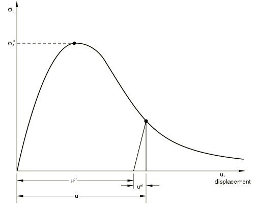 ![]() and is a linear function of , and is also defined by the user in the shear retention data. Here , where and are Macauley brackets, defining for any function f. CrackingAs soon as the crack detection surface () has been activated, we assume that cracking has occurred. The crack direction, , is taken to be the direction of that part of the maximum principal plastic strain increment conjugate to the crack detection surface, , that is orthogonal to the directions of any existing cracks at the same point. This crack orientation is stored for subsequent calculations, which are done for convenience in a local coordinate system oriented so that one of the coordinate directions is the crack direction, . Cracking is irrecoverable in the sense that, once a crack has occurred at a point, it remains throughout the rest of the calculation. Following crack detection, the crack affects the calculations by damaging the elasticity, as defined above. In addition, if the elastic strain across a crack is tensile, the invariants used in the crack detection surface are defined in the stress sub-space in which all stress components associated with the open crack direction are neglected, as described in the section above on yield. This implies that no more than three cracks can occur at any point (two in a plane stress case, one in a uniaxial stress case). Integration of the modelThe model is integrated using the backward Euler method generally used with the plasticity models in Abaqus. A material Jacobian consistent with this integration operator is used for the equilibrium iterations. |