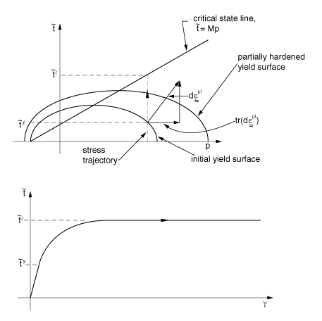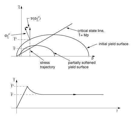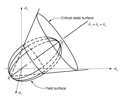 ProductsAbaqus/StandardAbaqus/Explicit The inelastic constitutive theory provided in Abaqus/Standard for modeling cohesionless materials is based on the critical state plasticity theory developed by Roscoe and his colleagues at Cambridge (Schofield et al., 1968, and Parry, 1972). The specific model implemented is an extension of the modified Cam-clay theory. The discussion is entirely in terms of effective stress: the soil may be saturated with a permeating fluid that carries a pressure stress and is assumed to flow according to Darcy's law. The continuum theory of this two phase material is described in Continuity statement for the wetting liquid phase in a porous medium. The basic ideas of the Cam-clay model are shown geometrically in Figure 1 to Figure 7. The main features of the model are the use of an elastic model (either linear elasticity or the porous elasticity model, which exhibits an increasing bulk elastic stiffness as the material undergoes compression) and for the inelastic part of the deformation a particular form of yield surface with associated flow and a hardening rule that allows the yield surface to grow or shrink. A key feature of the model is the hardening/softening concept, which is developed around the introduction of a “critical state” surface: the locus of effective stress states where unrestricted, purely deviatoric, plastic flow of the soil skeleton occurs under constant effective stress. This critical state surface is assumed to be a cone in the space of principal effective stress (Figure 1) whose axis is the equivalent pressure stress, p. Figure 1. Cam-clay yield and critical state surfaces in principal stress