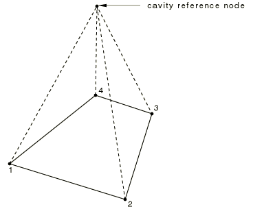 ProductsAbaqus/StandardAbaqus/Explicit In Abaqus/Explicit the fluid must be compressible and the pressure is calculated from the cavity volume. In Abaqus/Standard the fluid inside the cavity can be compressible or incompressible, with the fluid volume given as a function of the fluid pressure, p; the fluid temperature, ; and the fluid mass, m, in the cavity: We refer to the incompressible case as a “hydraulic” fluid and to the compressible case as a “pneumatic” fluid. The volume, , derived from the fluid pressure and temperature should equal the actual volume, V, of the cavity. In Abaqus/Standard this is achieved by augmenting the virtual work expression for the structure with the constraint equation and the virtual work contribution due to the cavity pressure: where is the augmented virtual work expression and is the virtual work expression for the structure without the cavity. The negative signs imply that an increase in the cavity volume releases energy from the fluid. This represents a mixed formulation in which the structural displacements and fluid pressure are primary variables. The rate of the augmented virtual work expression is obtained as Here, represents the pressure load stiffness, and is the volume-pressure compliance of the fluid. Since the pressure is the same for all surface facets (or elements) in the cavity, the augmented virtual work expression can be written as the sum of the expressions for the individual surface facets: Moreover, since the temperature is the same for all cavity facets, the fluid volume can be calculated for each facet individually: where is the element mass. In the solution the actual volume of the element may be different from the element volume: however, the total fluid volume will match the volume of the cavity. Hydraulic fluid with thermal expansionIn Abaqus/Standard the fluid is incompressible by default and the fluid volume, , is dependent upon temperature but independent of the fluid pressure: If compressibility is introduced, the fluid volume depends upon both the temperature and pressure: where K is the fluid bulk modulus and is the reference fluid density at zero pressure and the initial temperature. The total fluid mass in the cavity is the sum of the fluid masses of the elements making up the cavity: The mass of a fluid element in the cavity, , is calculated from the initial fluid density, , and the initial element volume, : where is the initial fluid pressure and is the initial temperature. The initial fluid density follows from the user-defined reference density, : The fluid density at the current pressure and temperature, , is obtained as where is the reference temperature for the coefficient of thermal expansion and is the mean (secant) coefficient of thermal expansion, and it is assumed that . Thus, the fluid volume at the current pressure and temperature is This volume can be calculated on an element by element basis: Fluid can be added to or removed from the cavity. The amount of fluid added is given as the change in (fluid) mass . Consequently, the change of the fluid volume at the current cavity temperature is Ideal gasIn this case the fluid is compressible, and the volume is a function of the pressure and the temperature in the cavity: where, as before, the total fluid mass in the cavity is the sum of the masses of the elements in the cavity. The fluid is assumed to behave like an ideal gas; hence, the density of the fluid in the cavity can be calculated as where is the gas constant, is the temperature at absolute zero, and is the ambient pressure. The current fluid volume can again be calculated on an element by element basis: The corresponding volume-pressure compliance is Fluid can be added to or removed from the cavity. The amount of fluid added is again given as the change in (fluid) mass. Consequently, the change of the fluid volume at the current cavity temperature is Volume calculationThe hydrostatic fluid elements appear as surface elements that cover the cavity boundary, but they are actually volume elements when the cavity reference node is accounted for. Figure 1 depicts the 4-node hydrostatic fluid volume element, F3D4. The dashed lines indicate that the element is actually pyramidal in shape. Figure 1. F3D4 hydrostatic fluid element.