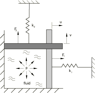 ![]() If the fluid is considered incompressible, application of the downward force causes the fluid to compress vertically and expand horizontally, while maintaining the original fluid volume. Thus, the model can be adequately discretized as a three degree of freedom system: the horizontal displacement of the right platen, u; the vertical displacement of the top platen, v; and the fluid pressure, p. The corresponding system of equations in matrix form is The equation solver processes the equations in sequence. Hence, it will process the submatrix relating the displacements to the forces prior to processing the constraints. This leads to a negative eigenvalue if . However since the mode associated with the negative eigenvalue is subsequently constrained by the continuity equation, no instability occurs. |