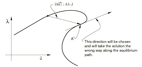 ![]() Suppose the solution has been developed to the point . The tangent stiffness, , is formed, and we solve The increment size in Figure 2) is chosen from a specified path length, , in the solution space, so that and, hence, (here is scaled by ). The value is initially suggested by the user and is adjusted by the Abaqus/Standard automatic load incrementation algorithm for static problems, based on the convergence rate. The sign of —the direction of response along the tangent line—is chosen so that the dot product of on the solution to the previous increment, , is positive: that is It is possible that in some cases, where the response shows very high curvature in the space, this criterion will cause the wrong sign to be chosen—see, for example, Figure 3. Figure 3. Example of incorrect choice of sign for .