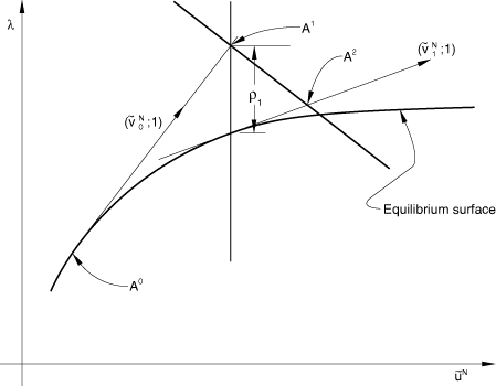 ![]() The wrong sign is rarely chosen in practical cases, unless the increment size is too large or the solution bifurcates sharply. To check for such cases is computationally expensive: one approach would be for the solution to be found at , so that we obtain a vector that gives a close approximation of the directed tangent at . Because the case is so rare, such a check is not included, and the simple dot product given above is used alone to determine the sign of . Thus, we have now found the point in Figure 2. The solution is now corrected onto the equilibrium path in the plane passing through and orthogonal to , by the following iterative algorithm.