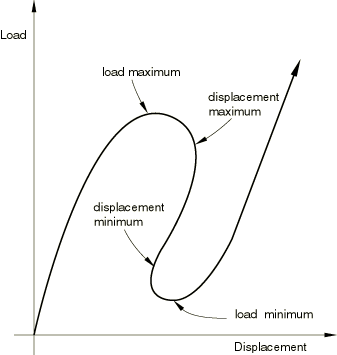 ProductsAbaqus/Standard It is often necessary to obtain nonlinear static equilibrium solutions for unstable problems, where the load-displacement response can exhibit the type of behavior sketched in Figure 1—that is, during periods of the response, the load and/or the displacement may decrease as the solution evolves. Figure 1. Typical unstable static response.