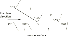 ProductsAbaqus/Standard A single slave node–based penetration criterion is used. Fluid will penetrate into the surface between the contacting bodies from one or multiple locations, which are exposed to the fluid, until a point is reached where the contact pressure is greater than the critical value specified by the user, cutting off further penetration of the fluid. The critical contact pressure is introduced to account for the asperities on the contacting surfaces. The higher this value, the easier the fluid penetrates. The default value of the critical contact pressure is zero, in which case fluid penetration occurs only if the contact pressure is zero and contact is lost. When a node has a contact status of “OPEN,” its nearest neighboring nodes are considered to be subjected to the fluid pressure as well. The nodes initially exposed to the fluid, which are specified by the user, will always be subjected to the fluid pressure irrespective of the contact status at these nodes. The pressure penetration load will be applied normal to the element surface based on the pressure penetration criterion described above at the beginning of an increment and will remain constant over that increment even if the fluid penetrates further during that increment. In two dimensions, a nodal integration scheme is used to integrate the distributed pressure penetration load over an element; the variation of the distributed load over an element will be determined by the load magnitudes at the element's nodes, which are coincident with the base points. Consider the contact interaction of three nodes—101, 102, and 103—on the slave surface made up of faces of two first-order elements, 1 and 2, with a master surface made up of faces of two elements, 4 and 5, which are described by nodes 201, 202, and 203 as shown in Figure 1. Figure 1. Pressure penetration with nonmatching meshes.