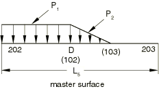 ![]() Because the fluid pressure will be simulated as a distributed load on the contacting surfaces, the variation of the load over an element needs to be described. For a first-order element if and are the equivalent forces at nodes 202 and 203 due to the distributed load shown in Figure 2, the variation of the distributed load over element 5 on the master surface is given by A similar approach is used for the second-order elements. |