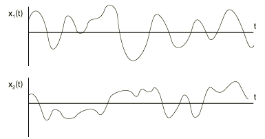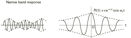 ![]() The autocorrelation, , thus tells us about the nature of the random variable. If drops off rapidly as the time shift moves away from , the variable has a broad frequency content; if it drops off more slowly and exhibits a cosine profile, the variable has a narrow frequency content centered around the frequency corresponding to the periodicity of . Figure 5. Narrow band record and its autocorrelation.