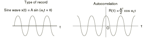 ![]() Let us now consider the opposite case, known as a “narrow band” function. The extreme case of such a function is a simple sinusoidal vibration at a single frequency: . Then must also be periodic, since must attain the same value, , each time the shift, , corresponds to the period of vibration. Performing the integration through time, Figure 4. Sine wave and its autocorrelation.