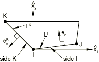 In the S4RSW element additional terms are added to the strain-displacement equations to eliminate the first shortcoming, and a shear projection is used in the calculation of the transverse shear to address the second shortcoming. The components of velocity strain in the S4RSW element are given in Belytschko et al. (1992) as where is the pseudonormal at node I and is given by where The pseudonormal represents a nodal normal local to a particular element found by taking the vector cross product of the adjacent element sides. The components of the transverse shear velocity strain are given by where nodal rotational components and are based on a projection and a transformation. Consider three adjacent local element nodes K, I, and J as shown in Figure 2. Outward facing vectors and are constructed perpendicular to element sides and , respectively. In addition, they are tangent to the reference surface at the midsides. Figure 2. Vector and edge definition for shear projection in the element S4RSW.