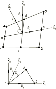 ProductsAbaqus/Explicit Corotational coordinate systemThe geometry of the shell is defined by its reference surface, which is determined by the nodal coordinates of the element. The embedded element corotational coordinate system, , is tangent to the reference surface and rotates with the element. This embedded corotational coordinate system serves as a local coordinate system and is constructed as follows: