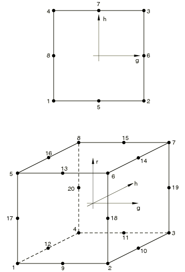 ProductsAbaqus/StandardAbaqus/Explicit The first-order elements are the 4-node quadrilateral for plane and axisymmetric analysis and the 8-node brick for three-dimensional cases. The library of second-order isoparametric elements includes “serendipity” elements: the 8-node quadrilateral and the 20-node brick, and a “full Lagrange” element, the 27-node (variable number of nodes) brick. The term “serendipity” refers to the interpolation, which is based on corner and midside nodes only. In contrast, the full Lagrange interpolation uses product forms of the one-dimensional Lagrange polynomials to provide the two- or three-dimensional interpolation functions. All these isoparametric elements are available with full or reduced integration. Gauss integration is almost always used with second-order isoparametric elements because it is efficient and the Gauss points corresponding to reduced integration are the Barlow points (Barlow, 1976) at which the strains are most accurately predicted if the elements are well-shaped. The three-dimensional brick elements can also be used for the analysis of laminated composite solids. Several layers of different material, in different orientations, can be specified in each solid element. The material layers or lamina can be stacked in any of the three isoparametric coordinates, parallel to opposite faces of the master element (Figure 1). These elements use the same interpolation functions as the homogeneous elements, but the integration takes the variation of material properties in the stacking direction into account. Hybrid pressure-displacement versions of these elements are provided for use with incompressible and nearly incompressible constitutive models (see Hybrid incompressible solid element formulation and Hyperelastic material behavior for a detailed discussion of the formulations used). InterpolationIsoparametric interpolation is defined in terms of the isoparametric element coordinates g, h, r shown in Figure 1. These are material coordinates, since Abaqus is a Lagrangian code. They each span the range to in an element. The node numbering convention used in Abaqus for isoparametric elements is also shown in Figure 1. Corner nodes are numbered first, followed by the midside nodes for second-order elements. The interpolation functions are as follows. First-order quadrilateral: Figure 1. Isoparametric master elements.