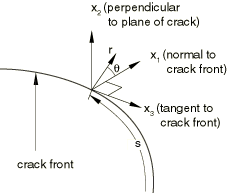 ProductsAbaqus/Standard The stress intensity factors , , and play an important role in linear elastic fracture mechanics. They characterize the influence of load or deformation on the magnitude of the crack-tip stress and strain fields and measure the propensity for crack propagation or the crack driving forces. Furthermore, the stress intensity can be related to the energy release rate (the J-integral) for a linear elastic material through where and is called the pre-logarithmic energy factor matrix (Shih and Asaro, 1988; Barnett and Asaro, 1972; Gao, Abbudi, and Barnett, 1991; Suo, 1990). For homogeneous, isotropic materials is diagonal and the above equation simplifies to where for plane stress and for plane strain, axisymmetry, and three dimensions. For an interfacial crack between two dissimilar isotropic materials with Young's moduli and , Poisson's ratios and , and shear moduli and , where and for plane strain, axisymmetry, and three dimensions; and for plane stress. Unlike their analogues in a homogeneous material, and are no longer the pure Mode I and Mode II stress intensity factors for an interfacial crack. They are simply the real and imaginary parts of a complex stress intensity factor, whose physical meaning can be understood from the interface traction expressions: where r and are polar coordinates centered at the crack tip. The bimaterial constant is defined as In this section we describe an interaction integral method (Shih and Asaro, 1988) to extract the individual stress intensity factors for a crack under mixed-mode loading. The method is applicable to cracks in isotropic and anisotropic linear materials. Interaction integral methodIn general, the J-integral for a given problem can be written as where correspond to when indicating the components of B. We define the J-integral for an auxiliary, pure Mode I, crack-tip field with stress intensity factor as Superimposing the auxiliary field onto the actual field yields Since the terms not involving or in and J are equal, the interaction integral can be defined as If the calculations are repeated for Mode and Mode , a linear system of equations results: If the are assigned unit values, the solution of the above equations leads to where The calculation of this integral is discussed next. Based on the definition of the J-integral, the interaction integrals can be expressed as with given as The subscript represents three auxiliary pure Mode I, Mode II, and Mode III crack-tip fields for , respectively. is a contour that lies in the normal plane at position s along the crack front, beginning on the bottom crack surface and ending on the top surface (see Figure 1). The limit indicates that shrinks onto the crack tip. Figure 1. Definition of local orthogonal Cartesian coordinates at the point s on the crack front; the crack is in the – plane.
