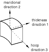 ![]() The integration is performed numerically. Assuming the path between point A and point B is divided uniformly into n intervals, the integrals are evaluated as follows: and where is the stress at point j along the path. Axisymmetric structuresThe derivation of the above equations is similar for the axisymmetric case, except for the fact that the neutral axis is shifted radially outward. Separate expressions are obtained for the stresses in the thickness, meridional, and hoop directions. In Abaqus/CAE these are represented as local directions 1, 2, and 3, respectively (see Figure 2). Figure 2. Stress directions.