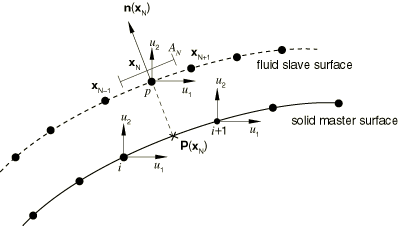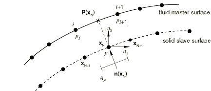![]() The contribution of a slave node to the coupling term in the structural equation is approximated by where is the pressure at master node and the sum is again over the master nodes in the vicinity of the slave node projection . |