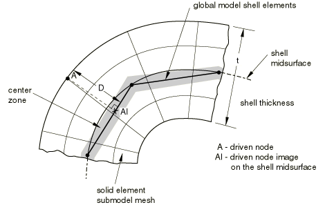 ![]() If the node is within the half thickness plus the exterior tolerance, it is accepted. This check is only approximate if the global model has varying shell thickness, and in that case it will not protect the user in parts of the global model that have a small thickness compared to the maximum thickness specified by the user. After the locations of the driven nodes (or image nodes for the shell-to-solid case) are determined, the prescribed values of the driven variables are interpolated from the values written to the file output for the global model. These must have been written with a sufficiently high frequency to obtain accurate values at the driven nodes. All components of displacements, temperatures, charges, and—for complex steady-state dynamic analysis—the phase angles as well as the amplitudes have to be written for the global model nodes from which the values for the driven nodes will be interpolated. For small global models responses will typically be written for all nodes. For large global models node sets can be created that contain the nodes in the regions around the submodel boundary. For solid-to-solid and shell-to-shell submodeling, the interpolated values of displacements, rotations, temperatures, etc. are applied directly to the driven nodes. For these nodes the user can specify the individual degrees of freedom that are driven. Driven variables for shell-to-solid submodelingIn the shell-to-solid case the driven degrees of freedom are chosen automatically, depending on the distance between the driven node and the midsurface of the shell. If the node lies within the center zone (specified by the user; see Figure 2), all displacement components are driven. If the node lies outside the center zone, only the displacement components parallel to the shell midsurface are driven. By default, the size of the center zone is taken as 10% of the maximum shell thickness. The procedure is described in detail below. The center zone should be large enough so that it contains at least one layer of nodes. If the transverse shear stresses at the submodel boundary are high and the submodel is highly refined in the thickness direction, this can result in high local stresses, since the shear force at the submodel boundary is only transferred at the driven nodes within the center zone. High transverse shear stresses occur only in regions where bending moments vary rapidly, and it is better not to locate the submodel boundary in such regions. It is best to locate the submodel boundary in areas of low transverse shear stress in the global model. All displacement degrees of freedom are driven when the driven node lies within the center zone. For geometrically linear analysis these prescribed displacements are obtained from the displacements and rotations of the image node as where is the prescribed displacement of driven node A, and are the interpolated displacement and rotation of the image node, and is the vector connecting the image node to the driven node: For large-displacement analysis finite rotations must be taken into account. The finite rotation equivalent of Equation 1 is where is the rotation matrix as defined in Rotation variables, is the identity tensor, and is the rotated vector connecting the image node to the driven node in the current configuration: For driven nodes outside the center zone only the displacement components parallel to the shell midsurface are driven. For the geometrically linear case this leads to the constraints where and are two (unit) vectors orthogonal to . The equivalent expressions for the geometrically nonlinear case are where and are two (unit) vectors orthogonal to . Since the submodeling capability in Abaqus is quite general and allows the use of different procedure types in both analyses, there are several possibilities for the evaluation of the values at driven nodes as follows. In all cases Abaqus assumes that the global model and the submodel both use small- or large-displacement theory. In the schemes listed below the first procedure type applies to the global analysis and the second to the submodel analysis.