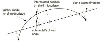 ProductsAbaqus/StandardAbaqus/Explicit Submodeling can be applied quite generally in Abaqus. With a few restrictions different element types can be used in the submodel compared to those used to model the corresponding region in the global model. Both the global model and the submodel can use solid elements, or they can both use shell elements. A special option is available to use a submodel consisting of solid elements with a global model consisting of shell elements. The material response defined for the submodel may also be different from that defined for the global model. Both the global model and the submodel can have nonlinear response and can be analyzed for any sequence of analysis procedures. The procedures do not have to be the same for both models. The submodel is run as a separate analysis. The only link between the submodel and the global model is the transfer of the time-dependent values of variables to the relevant driven variables of the submodel. The only information in the global model available to the submodel analysis is the file output data written during the global model analysis. These data contain, by default, the undeformed coordinates of all global model nodes and element information for all elements in the global model (see Results file output format). The user must have requested appropriate responses in the area where the submodel boundary is located. Two forms of the submodeling technique are implemented in Abaqus. The more general node-based submodeling technique transfers node-located solution variables, most commonly displacements, from global model nodes to submodel nodes. A surface-based submodeling technique, which transfers material point stress results from the global model to surface load integration points in the submodel, is also available. Node-based submodelingNode-based submodeling is the most commonly used technique. With this technique global model responses are used to prescribe boundary conditions at the driven nodes in the submodel. Interpolation procedure and tolerance checkingIn the solid-to-solid case the positions of the submodel boundary nodes (the driven nodes) are determined with respect to the global model, and the appropriate element interpolation functions are used to obtain the values of the degrees of freedom at the driven nodes. An “exterior tolerance,” which the user can specify, is used to check whether it is valid to extrapolate values from the global model. In cases where the submodel boundary nodes fall outside the global model, the extrapolation is valid if the distance between the driven nodes and the free surface of the global model falls within the specified tolerance. A similar check is done along the global model boundaries for the shell-to-shell submodeling case. We also check whether the driven nodes of the submodel lie sufficiently close to the midsurface of the shell elements in the global model. To simplify the calculations, the closest point in the global model is approximated by measuring the distance in the direction normal to a flat approximation to each shell element in the global model, as shown in Figure 1. Figure 1. Flat surface approximation in shell-to-shell submodeling.