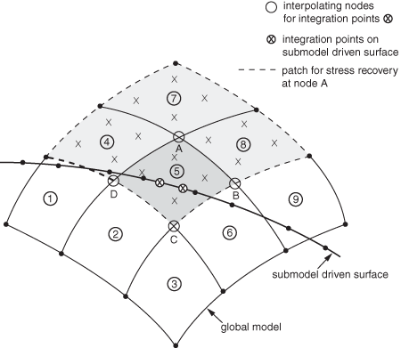 ![]() Because the driving node stress result is a function of the neighboring element stress results, the elements in the global model that contribute to the driving stress at a particular integration point extend beyond the global element encompassing the driven integration point. Consider the submodel driven surface shown in Figure 4. Figure 4. The extent of global elements contributing to a driving stress for