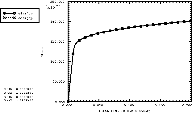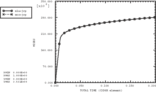 ![]() Figure 2. Mises stress in uniaxial tension: elastic response versus linear