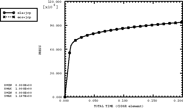 ProductsAbaqus/Explicit Linear Us − Up Hugoniot equation of stateElements testedC3D8R CPE4R Features testedLinear equation of state (EOS) material model with plasticity. Problem descriptionThis verification test consists of a list of single-element models that use either C3D8R or CPE4R elements and are run under simple loading conditions (uniaxial tension, uniaxial compression, and simple shear). The purpose of this example is to test the equation of state material model and its combination with the Mises and Johnson-Cook plasticity models. Two parallel sets of models are studied. The first set uses the linear elastic, linear elastic with Mises plastic, and linear elastic with Johnson-Cook plastic materials. The second set uses the linear type of EOS, linear type of EOS with Mises plastic, and linear type of EOS with Johnson-Cook plastic materials. For linear elasticity the volumetric response is defined by where K is the bulk modulus of the material. The linear Hugoniot form is where is the same as the nominal volumetric strain measure, . Thus, setting the parameters 0.0 and 0.0 gives the simple hydrostatic bulk response, which is identical to the elastic volumetric response. The elastic deviatoric response of the material is defined by the shear modulus. The elastic material properties are Young's modulus = 207 GPa and Poisson's ratio = 0.29. The initial material density, , is 7890 kg/m3. The equivalent properties for the linear type of equation of state material model are = 4563.115 m/s and shear modulus = 80.233 GPa. For models in which plasticity (including both Mises and Johnson-Cook plasticity models) is used, the plastic hardening is chosen to be where is the yield stress (in units of MPa) and is the equivalent plastic strain. Results and discussionThe results obtained from the analyses that use the EOS material model match the corresponding results obtained from the analyses that use the linear elasticity model. The comparison of the pressure and Mises stresses obtained with the EOS material model (with Johnson-Cook plastic shear response) and the linear elasticity model (with the same Johnson-Cook plastic shear response) using the C3D8R element under uniaxial tension loading are shown in Figure 1 and Figure 2, respectively. The uniaxial compression comparisons are shown in Figure 3 and Figure 4. Input files